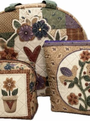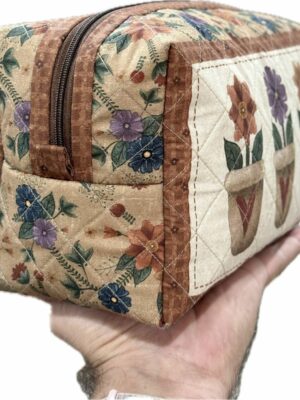 - Estampa estilo patch country com elementos florais, corações e vasos, em tons quentes e terrosos