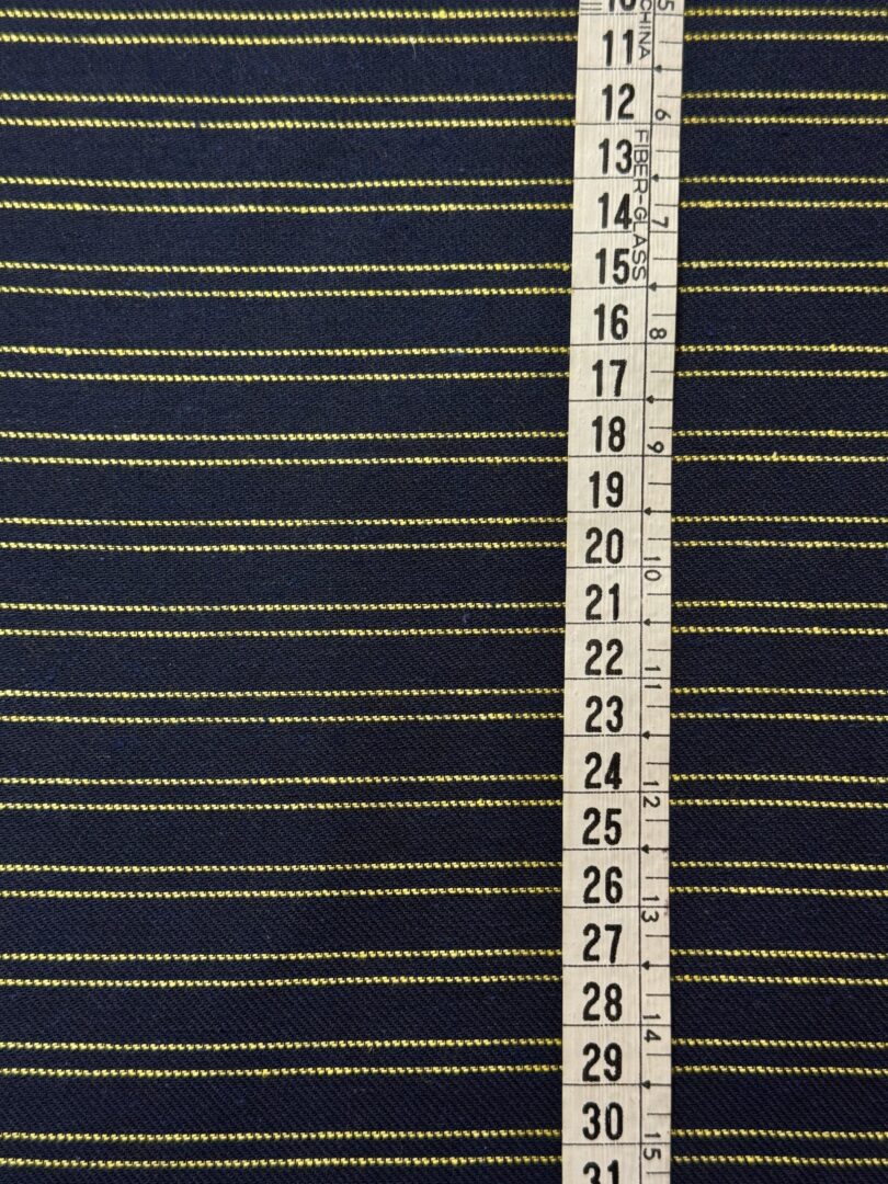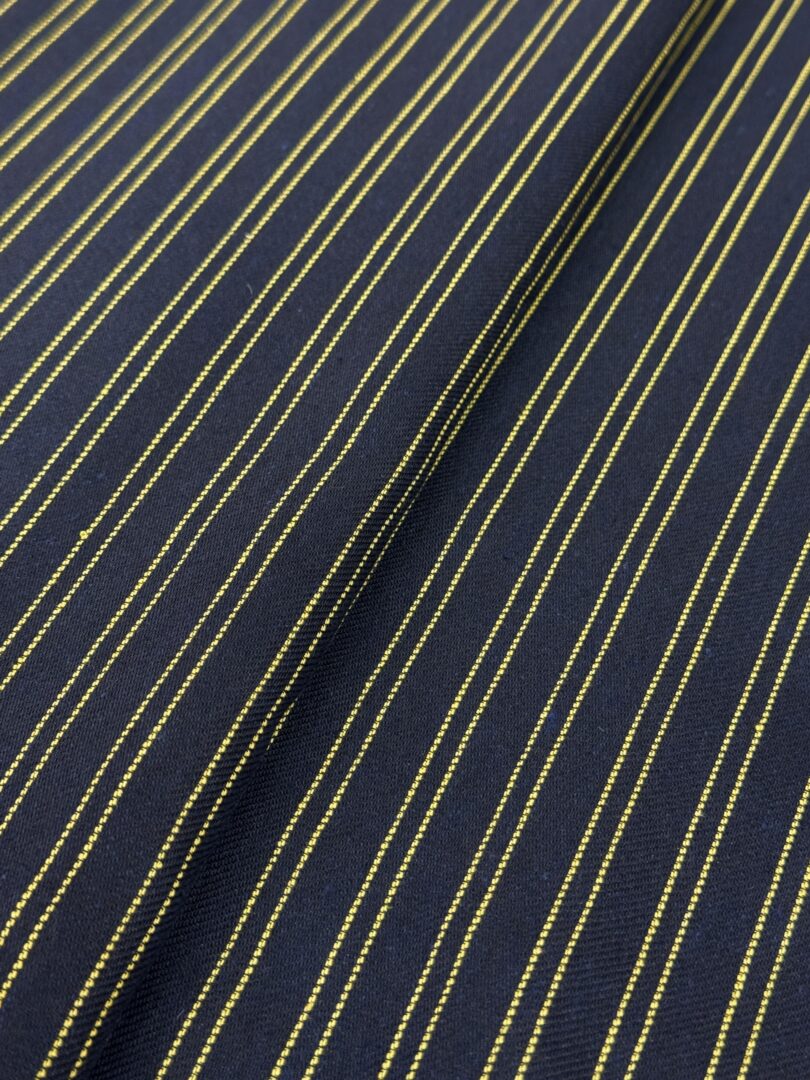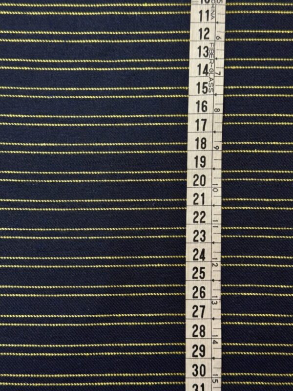 O Tecido Belém Variante 3 traz um padrão listrado sofisticado em azul marinho com listras amarelas, criando contraste marcante e moderno. Sua estrutura encorpada garante firmeza e caimento definido, enquanto a mistura de algodão e poliéster proporciona equilíbrio entre conforto, resistência e praticidade.