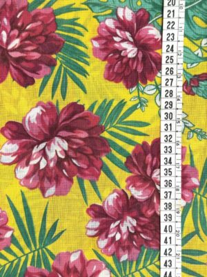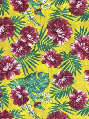 O Tecido Chitão Tropical traz uma combinação vibrante de flores vinho com folhagens verdes sobre um fundo amarelo intenso, criando um visual alegre e cheio de vida. O tecido possui toque firme e estrutura encorpada, sendo ideal para trabalhos criativos que valorizam cor e expressividade.