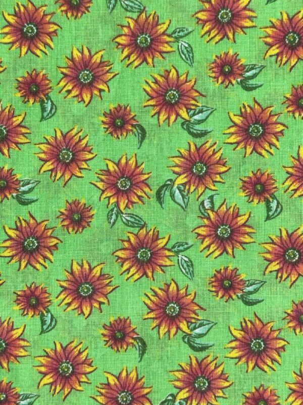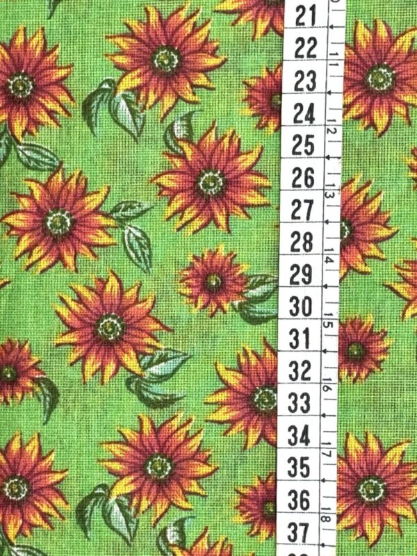 O Tecido Chitão é conhecido por suas estampas florais grandes e alegres, que traduzem toda a vivacidade da cultura brasileira. Com fundo verde vibrante e flores em tons de amarelo, vermelho e laranja, este modelo é perfeito para quem busca um visual marcante e cheio de cor. Possui toque firme, boa estrutura e excelente rendimento.