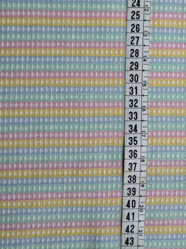 O Tecido Elizabeth Variante 2 é alegre e vibrante, trazendo uma combinação harmoniosa de cores em listras geométricas nos tons de rosa, azul, verde, amarelo e branco. Produzido em algodão puro, oferece conforto, toque macio e excelente respirabilidade. Seu grande diferencial está no comportamento após a lavagem: o tecido encolhe levemente e os fios se abrem, criando uma textura única e ainda mais valorizada.