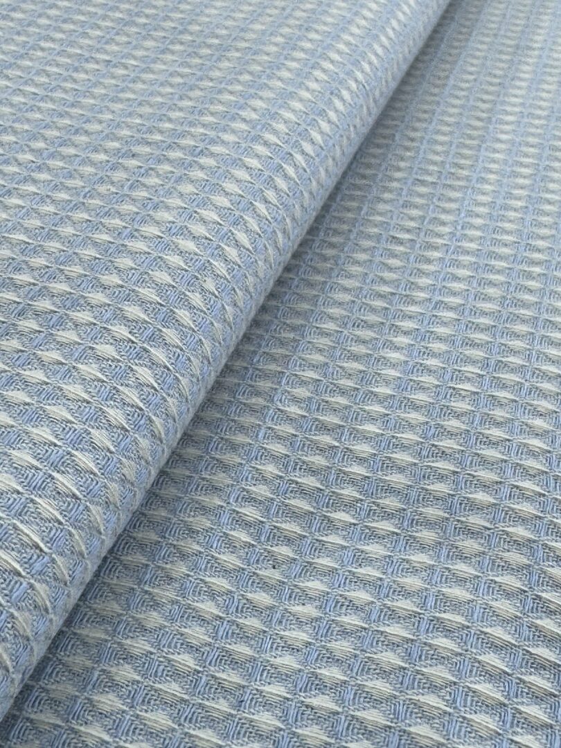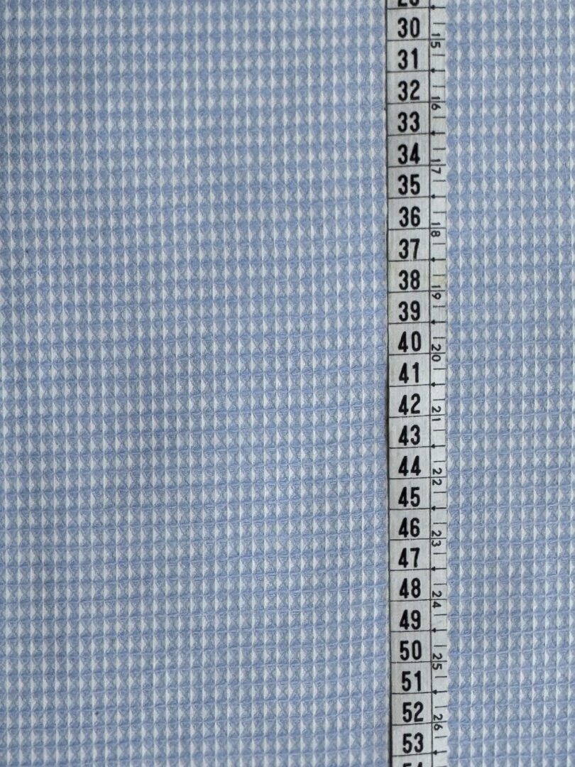 O Tecido Elizabeth Variante 7 apresenta um delicado tom azul combinado ao branco, formando um desenho geométrico que transmite frescor e elegância. Produzido em algodão puro, oferece maciez, respirabilidade e um visual leve que se adapta a diferentes propostas criativas. Seu diferencial está no comportamento após a lavagem: o tecido encolhe levemente e os fios se abrem, revelando uma textura única e ainda mais charmosa.