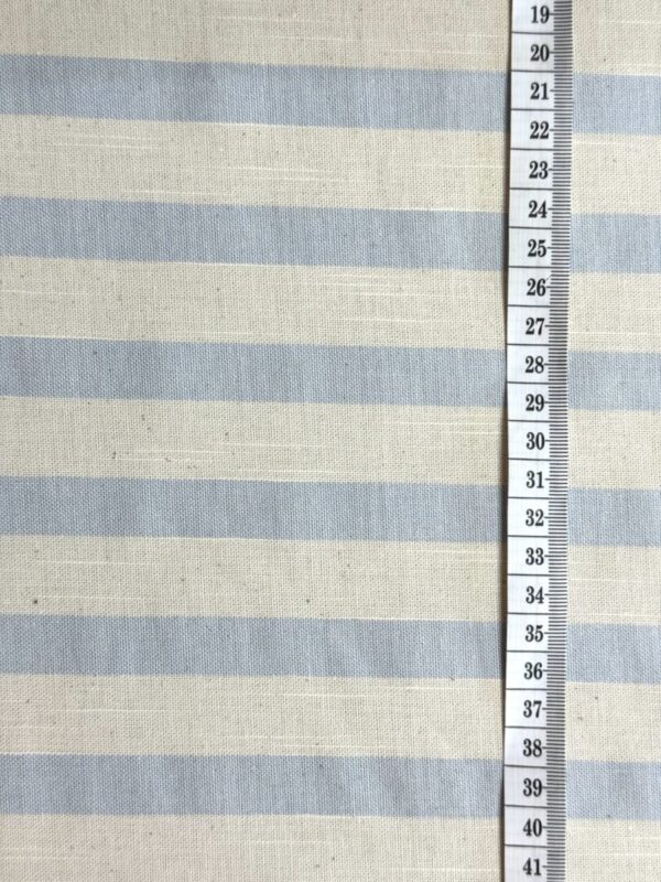 O Tecido Pamplona Variante 02 apresenta uma padronagem clássica de listras horizontais em azul-claro e cru, resultando em um visual leve, elegante e atemporal. Produzido em algodão puro, oferece toque natural, conforto térmico e excelente respirabilidade, sendo ideal para roupas casuais e projetos artesanais.