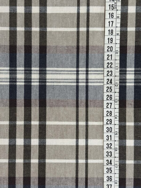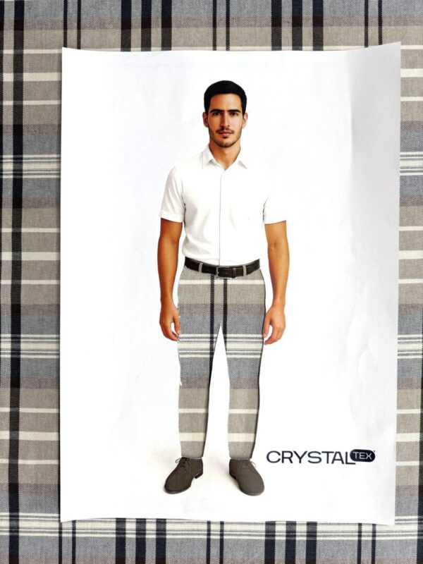 O Roma Xadrez Variante 4 apresenta uma padronagem clássica em tons de cinza, bege e azul petróleo, com linhas marcadas que formam um xadrez elegante e equilibrado. O tecido é totalmente em algodão, garantindo um toque macio, excelente respirabilidade e conforto ao vestir.