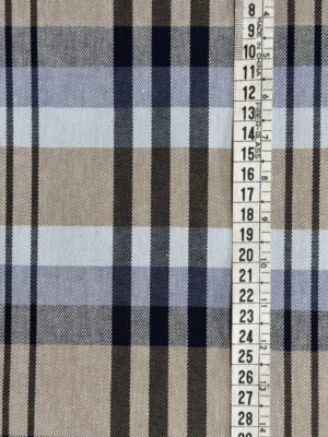 O Roma Xadrez Variante 3 combina tons neutros e sofisticados, com faixas em bege, azul-claro e azul-marinho em uma padronagem ampla e elegante. O tecido tem toque encorpado e macio, típico do algodão, oferecendo conforto e estrutura equilibrada para diversas criações.