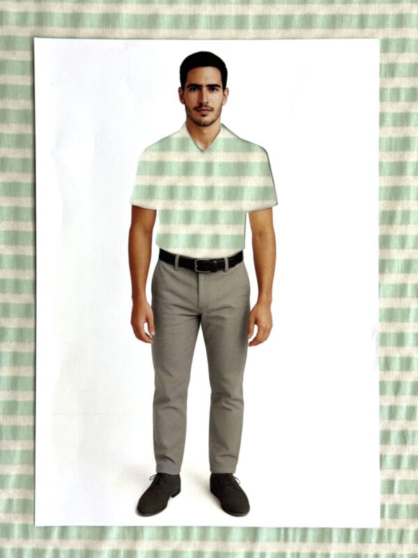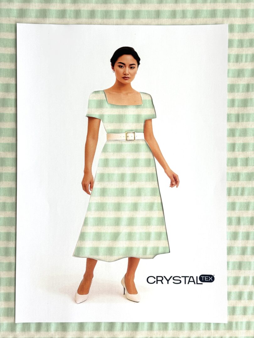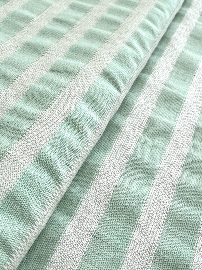 O Tecido Ternura Variante 04 traz uma padronagem listrada em tom verde-menta e cru, que transmite suavidade e frescor. Sua mistura de fibras naturais e sintéticas proporciona toque macio, leve elasticidade e excelente caimento, ideal para peças que unem conforto e elegância.