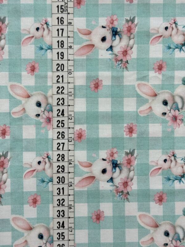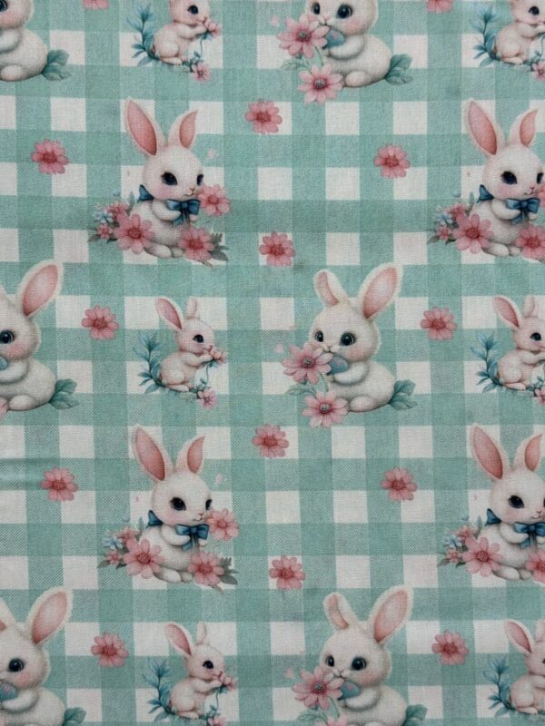 Tecido tricoline com fundo verde em padrão xadrez branco, estampado com delicados coelhinhos em diferentes poses, rodeados de flores cor-de-rosa. A estampa transmite um ar suave e encantador, ideal para criações delicadas e cheias de ternura.