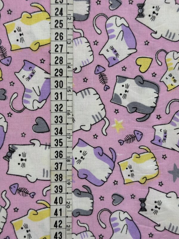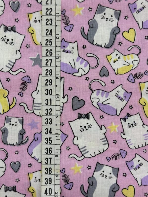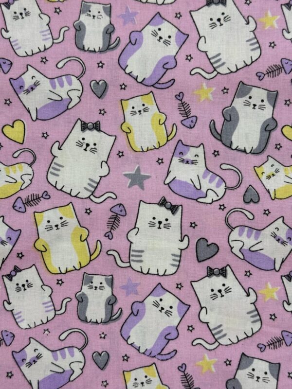 Tecido tricoline de fundo rosa com estampa encantadora de gatinhos em diferentes poses, acompanhados de corações, estrelas e peixinhos. Os desenhos aparecem em tons de lilás, amarelo, cinza e branco, criando um visual divertido e delicado. Uma estampa lúdica e versátil, perfeita para projetos criativos e cheios de charme.