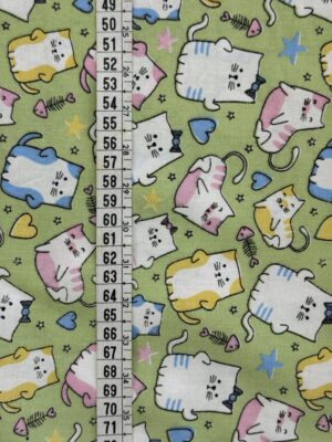 Estampa: Gatinhos divertidos em branco com detalhes em rosa, azul, amarelo e cinza, acompanhados de corações, estrelas e peixinhos sobre fundo verde suave.
