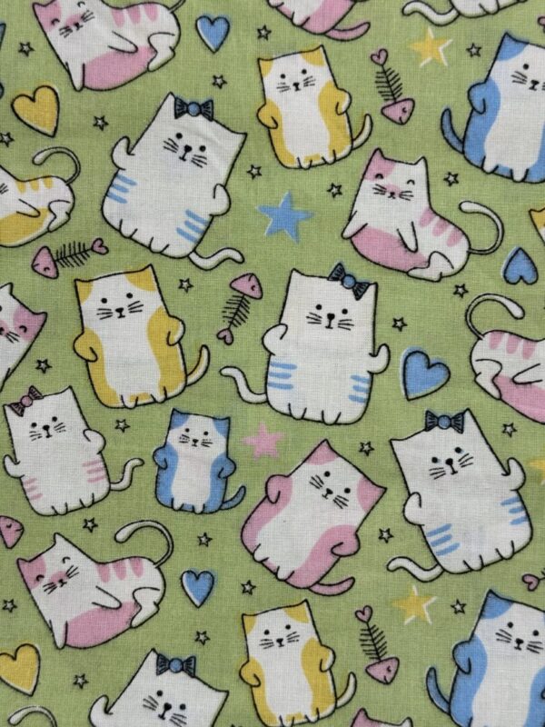 Estampa: Gatinhos divertidos em branco com detalhes em rosa, azul, amarelo e cinza, acompanhados de corações, estrelas e peixinhos sobre fundo verde suave.