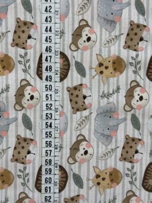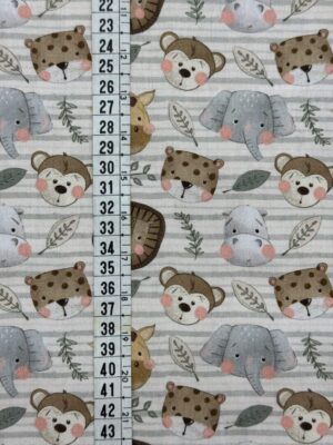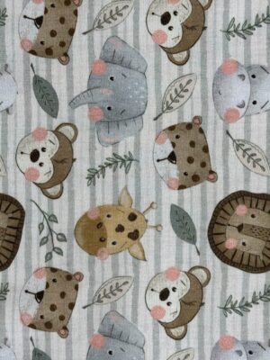 Tecido tricoline com fundo bege listrado em tom suave, estampado com animais da selva em estilo infantil, como leões, ursos, girafas, elefantes, hipopótamos e onças, além de folhagens delicadas que completam o design. Os desenhos em tons terrosos e acinzentados trazem uma proposta acolhedora e charmosa, ideal para composições modernas e temáticas.