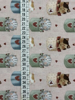 Tecido tricoline com fundo bege claro e estampa fofa de gatinhos dentro de bolsinhos, decorados com corações e detalhes em tons de verde, azul e bege. Os desenhos delicados trazem um charme aconchegante e alegre, ideal para quem busca um toque de ternura em seus projetos.