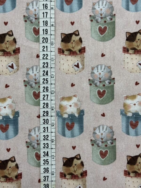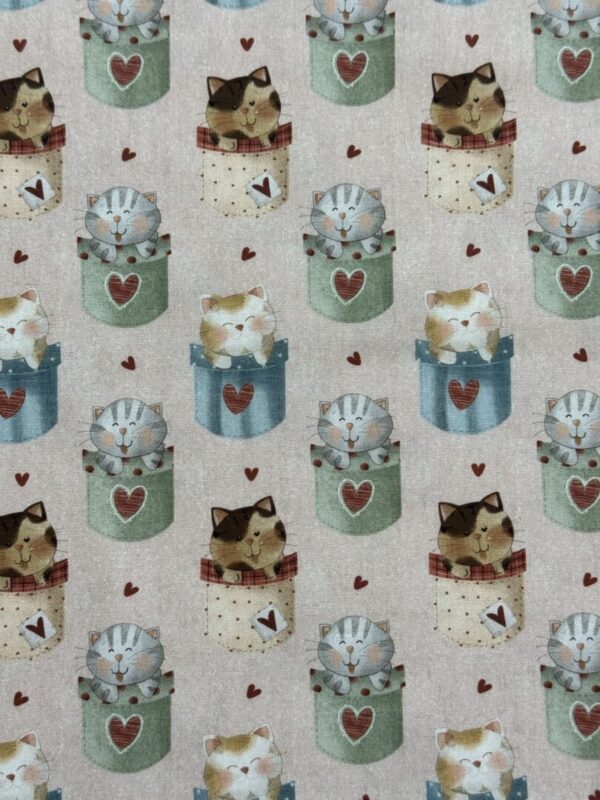 Tecido tricoline com fundo bege claro e estampa fofa de gatinhos dentro de bolsinhos, decorados com corações e detalhes em tons de verde, azul e bege. Os desenhos delicados trazem um charme aconchegante e alegre, ideal para quem busca um toque de ternura em seus projetos.