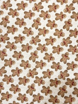 Tecido tricoline com fundo creme e estampa de simpáticos bonequinhos de gengibre, conhecidos como cookies, com detalhes em tons de marrom e vermelho. O visual remete ao aconchego das festas natalinas e ao estilo artesanal das decorações de fim de ano, trazendo um toque doce e acolhedor para suas criações.
