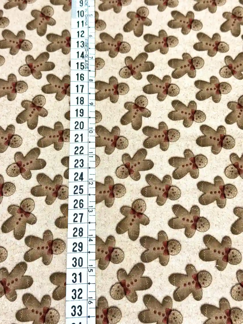 Tecido tricoline com fundo creme e estampa de simpáticos bonequinhos de gengibre, conhecidos como cookies, com detalhes em tons de marrom e vermelho. O visual remete ao aconchego das festas natalinas e ao estilo artesanal das decorações de fim de ano, trazendo um toque doce e acolhedor para suas criações.