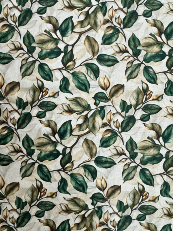 - Estampa: Digital de alta resolução com padrão de folhagens em tons creme