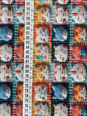 Tecido tricoline com estampa criativa de gatinhos estilizados em quadrados coloridos, simulando um efeito patchwork. A cartela de cores traz tons vibrantes de azul, laranja, amarelo e vermelho, combinados em padronagens de poás e xadrez, criando um visual alegre e dinâmico. Ideal para quem busca um tecido divertido e cheio de personalidade.