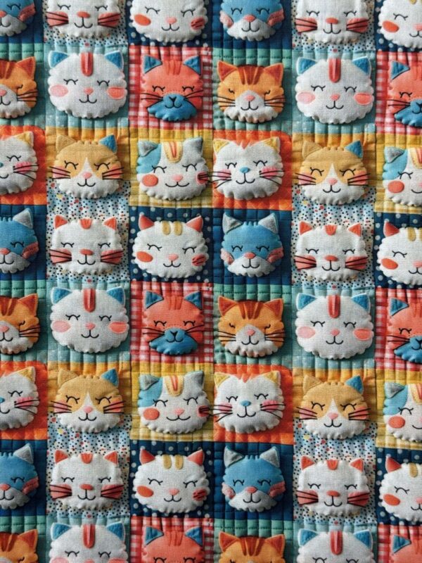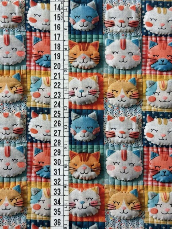 Tecido tricoline com estampa criativa de gatinhos estilizados em quadrados coloridos, simulando um efeito patchwork. A cartela de cores traz tons vibrantes de azul, laranja, amarelo e vermelho, combinados em padronagens de poás e xadrez, criando um visual alegre e dinâmico. Ideal para quem busca um tecido divertido e cheio de personalidade.