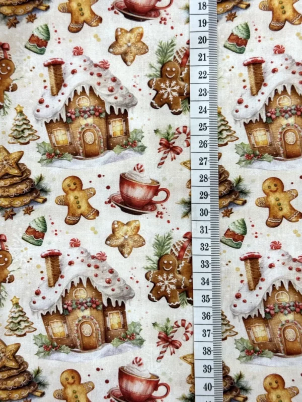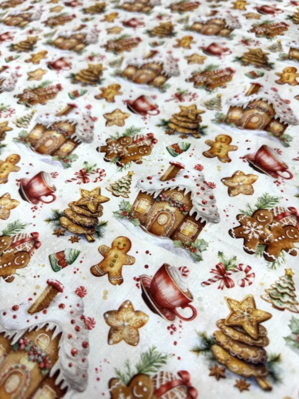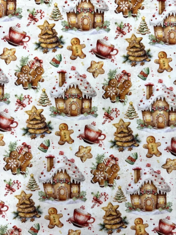 O Tricoline Sweet Christmas 1 é um tecido encantador que traz toda a doçura e o aconchego das festas de fim de ano. Com uma estampa lúdica de biscoitos “Gingerbread”, xícaras de chocolate quente, bengalas de açúcar e casinhas de gengibre, este tecido é uma edição Especial de Natal pensada para projetos que transbordam carinho. Sendo 100% algodão, ele oferece a maciez e a durabilidade ideais para criações artesanais de alto padrão.