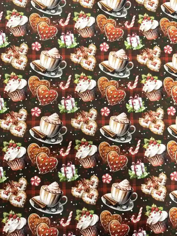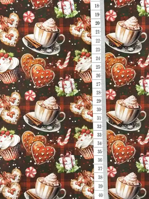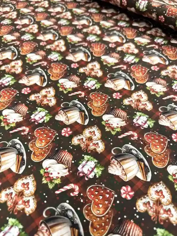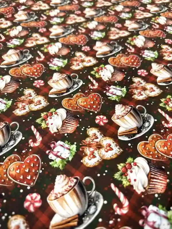 O Tricoline Sweet Christmas 7 é a escolha perfeita para quem deseja uma decoração de Natal com um toque de “cafeteria gourmet” e muito aconchego. Com uma estampa rica sobre um fundo xadrez clássico em tons de marrom e vermelho, ele apresenta elementos deliciosos como xícaras de chocolate quente com chantilly, cupcakes decorados, biscoitos em formato de coração e bengalas de açúcar. Sendo 100% algodão, oferece a durabilidade e a maciez ideais para peças que exigem um acabamento refinado.