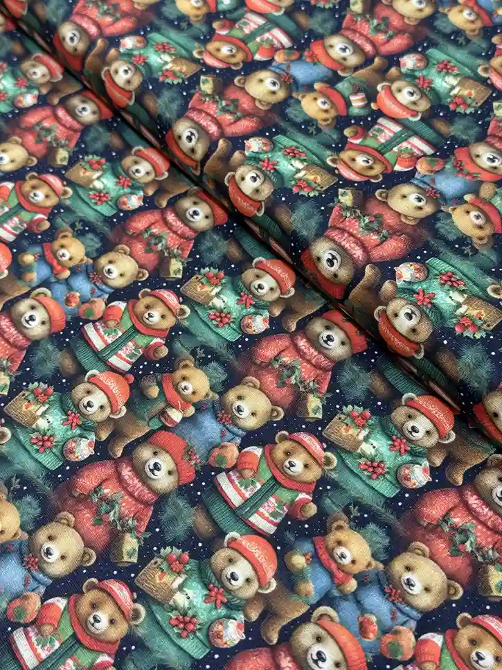 O Tricoline Ursinhos Natalinos é a escolha perfeita para quem deseja um Natal repleto de fofura e delicadeza. Com uma estampa lúdica sobre um fundo azul marinho profundo que remete a uma noite estrelada, ele apresenta ursinhos carinhosos vestidos com roupas de inverno em tons de vermelho e verde, segurando cestinhas de azevinhos. Sendo 100% algodão, este tecido oferece a maciez e a durabilidade ideais para projetos voltados ao público infantil e decorações acolhedoras.